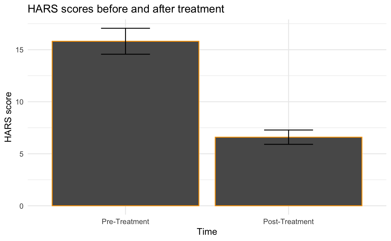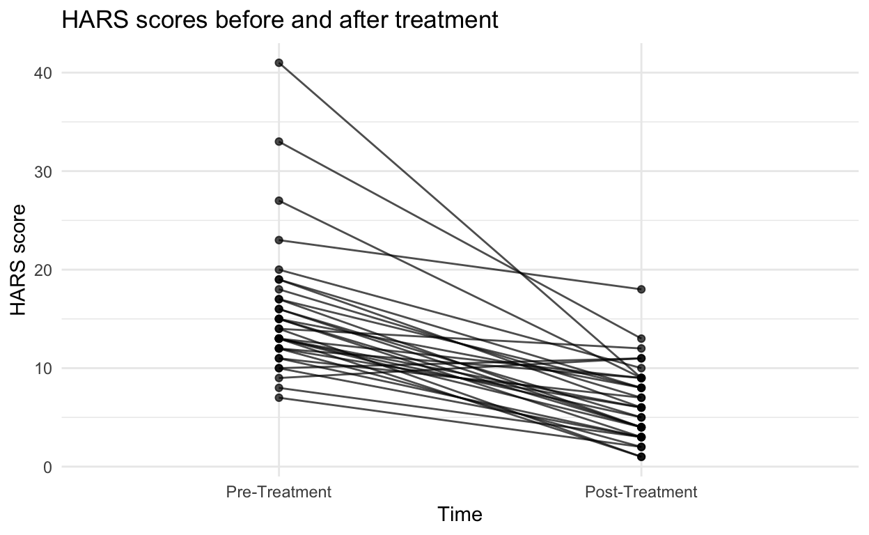 labs(x = "Time", y = "HARS score", title = "HARS scores before and after treatment")