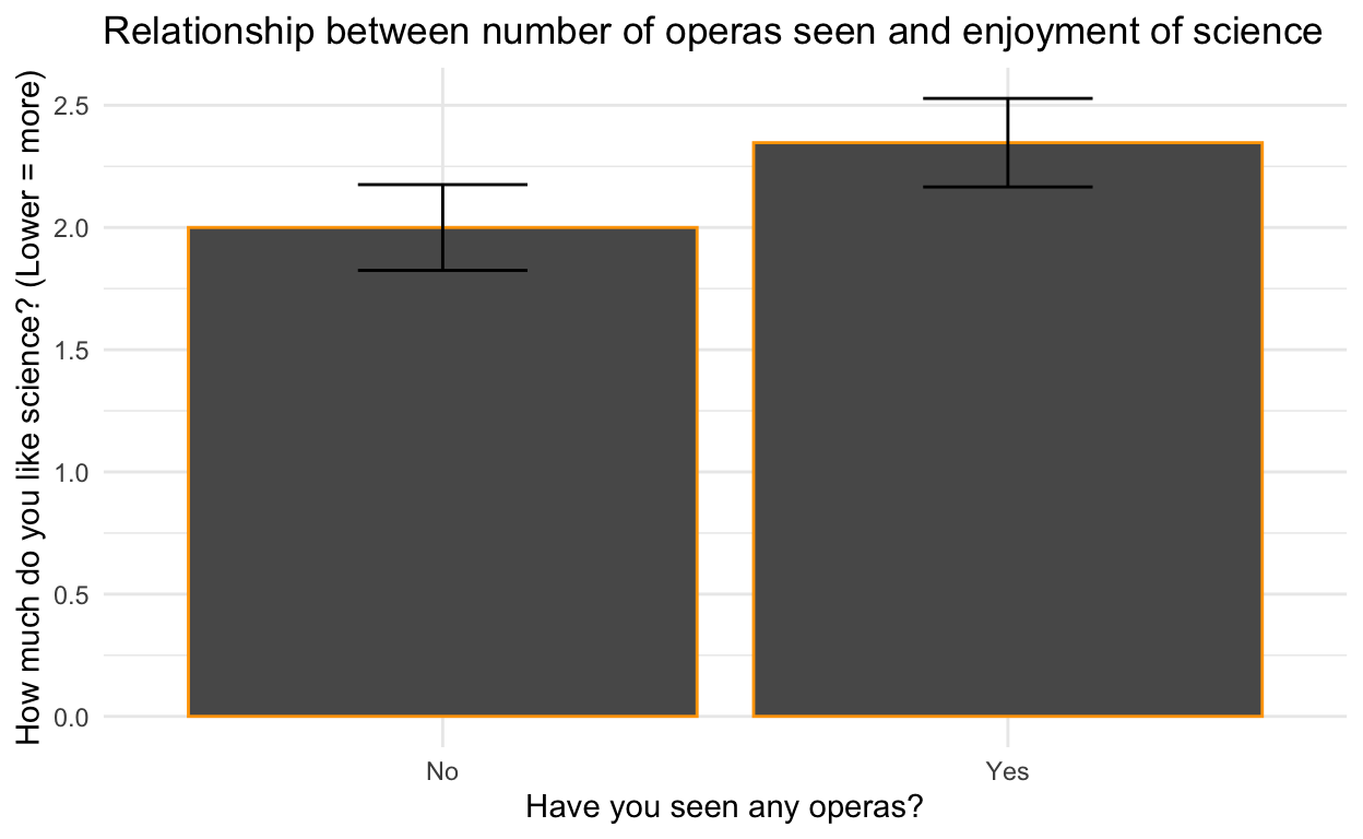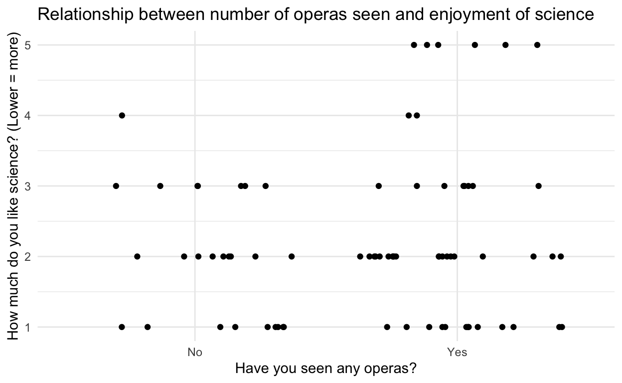 labs(x = "Have you seen any operas?", y = "How much do you like science? (Lower = more)", title = "Relationship between number of operas seen and enjoyment of science")