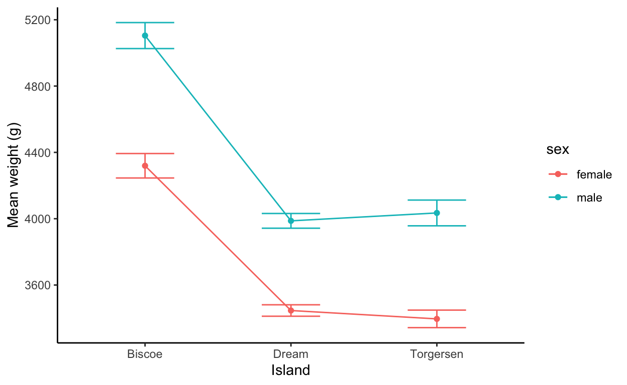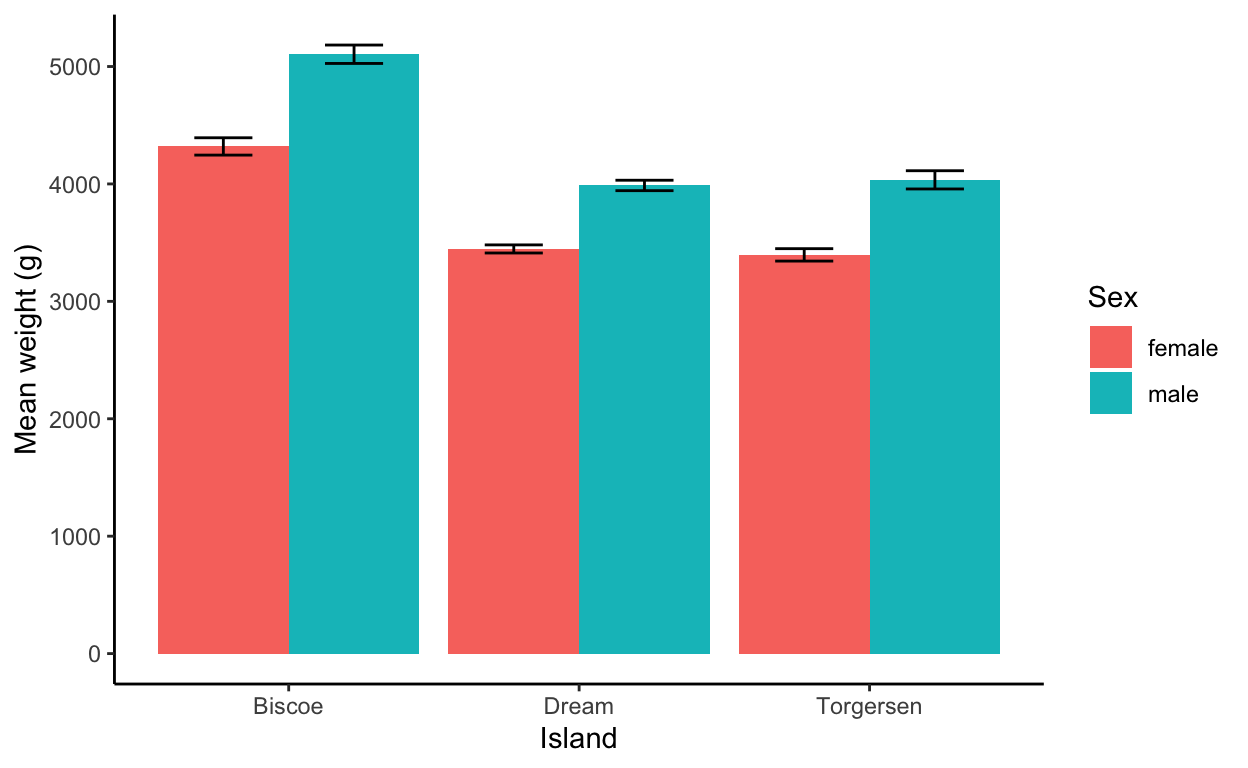 labs(x = "Island", y = "Mean weight (g)", fill = "Sex")