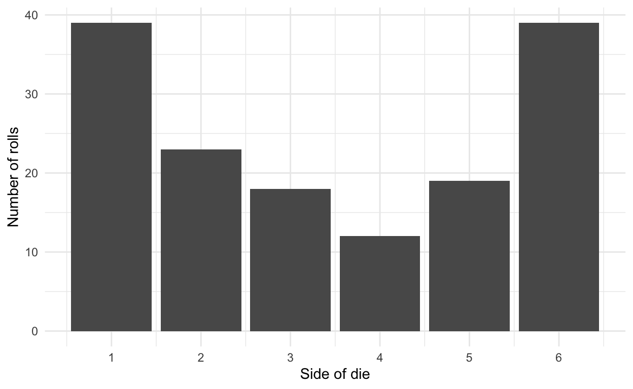 labs(x = "Side of die", y = "Number of rolls")