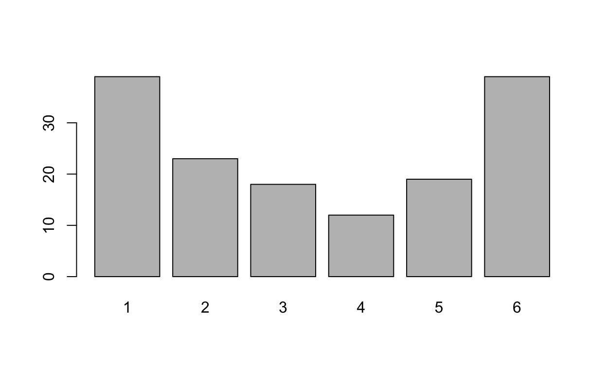 rolls = sample(c(1:6), 150, replace = TRUE, prob = c(.3,.1,.1,.1,.1,.3))